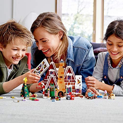 Details: Enjoy a festive build-and-play experience with the LEGO® Creator Expert 10267 Gingerbread House. A treasure chest of magical details, this amazing model features frosted roofs with colorful candy buttons and a delicious facade with candy-cane columns, glittery windows and a tall chimney stack with a glowing fireplace. Inside the house there’s an array of fun details and candy furnishings including a tasteful bedroom with chocolate bed and cotton candy lamp, and a bathroom with the essential toilet and bathtub. Children can light up the cozy fireplace by pressing on the chimney smoke, help clear the sidewalk with the snow blower and nestle the gingerbread baby in its carriage. It also includes a decorated holiday tree with wrapped gifts and toys, including a rocking horse and a toy train. This advanced LEGO® set delivers a challenging and rewarding building experience and makes a great seasonal centerpiece for the home or office. Includes gingerbread man, woman and baby figures.